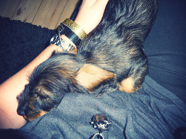 Var ude at besøge ham her i går, Albert gravhund 8 uger. En af mine veninder er lige blevet den lykkelige ejer af ham og jeg er altså nem at lokke på besøg hvis der er hundebaby. Så sød og klodset og dufter/lugter på den der helt specielle hvalpemåde (ligesom at babyer dufter helt specielt). Er helt hvalpeskruk nu.