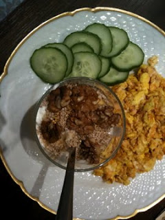 Øverst dagens morgenmad; røræg med laks og gurkemaje (staves det sådan? bliver helt i tvivl), agurk + yoghurt med sesam og valnødder.