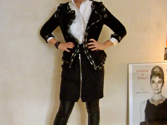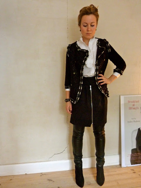 Jakke fra Because, nederdel fra Whistles, vintage skjorte fra Smukt Brugt, læderlegging og støvletter fra Topshop