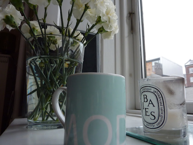 Har fået smoothie med mango og melon og sidder nu og drikker kaffe af mit mintfarvede krus fra Tate Modern og læser og kigger på de hvide nelliker jeg fik for bare 10 kr. i går hos min blomsterhandler. Afskårne blomster på budget, me likey ;) Vildt så meget blomster gør for humøret, måske fordi de minder om forår og lysere tider (og høfeber). Nelliker er min yndlingsblomst og en af de eneste blomster jeg kan lide i alle farver (pink, lyserød, lysegrøn og hvid er favoritterne, men er også all in på rød, gul og blå/lilla). At nelliker er billige og super holdbare er jo bare en bonus, men holder simpelthen bare af dem fordi jeg synes de er pæne. Men det er jeg vist ret alene om eller hvordan? Synes altid at folk taler grimt om nelliker, især ældre mennesker, noget med at det var en begravelsesblomst tidligere?