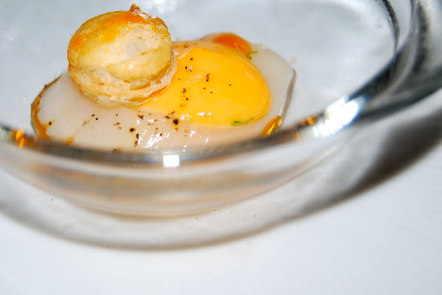 Som appetizer fik vi en kammusling med chili mayonnaise og som forret torsk (med torskerogn på) med hummerbouillon og jordskok. Her bliver jeg også lige nød til at nævne brødet, der selvfølgelig var hjemmebagt, og hvor den ene slags var et herligt fedtet lille madbrød som jeg havde lyst til at få en hel kurv med hjem af. Havde egentlig også lyst til at spise hele kurven mens vi var der, men klog af skade lod jeg være med at spise mig mæt i brød og nøjedes med et ;)