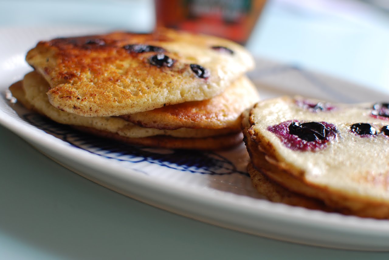 I morges (eller formiddags…, kom lige til at drikke en fyraftensøl eller to efter arbejde i går) stod den på blåbærpandekager og de blev noget så fine. Gider ellers som regel ikke at lave amerikanske pandekager fra bunden, da jeg synes det er svært at få dem tykke og luftige, men denne opskrift fungerede ;)