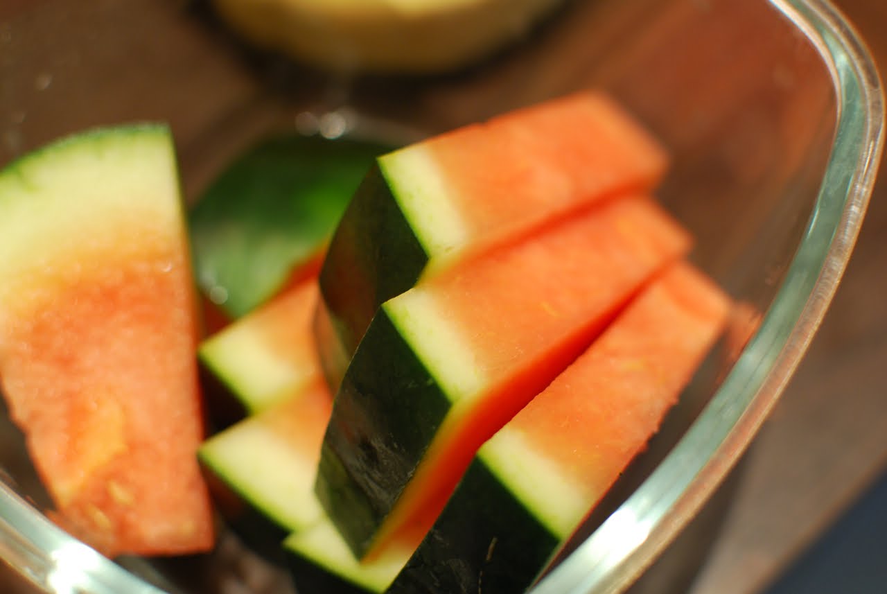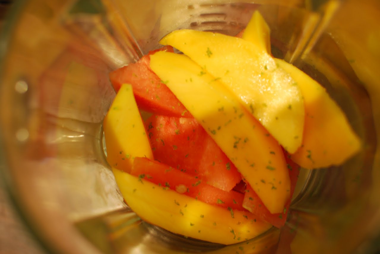 Blend a slice of watermelon with half a mango, some frozen strawberries, soy milk, vanilla essence, grated zest and juice from one lime, a tablespoon of flaxseed oil and two tablespoons of whey protein (oil and protein are optional, but I do it to make a more wholesome meal out of a smoothie). Enjoy!