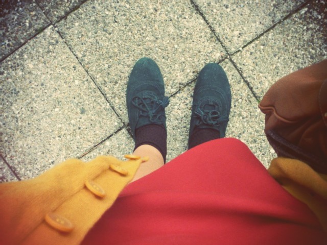 I går legede jeg trafiklys med rød kjole, gul cardigan og grønne sko, hehe.