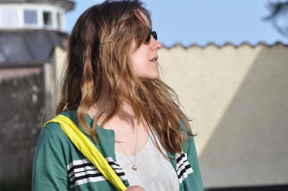 Lækkert outfit! Det er rigtig flot med den gule taske og den blå cardigan sammen :)