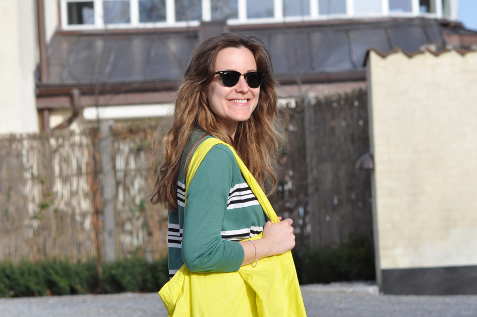 Super lækkert outfit hvor du har kombineret afdæmpede farver med pangfarver på pose og sko – det er meget forskellige typer af farver som du får til at hænge meget smukt sammen. Og kan godt forstå du er glad for bukserne for de klæder dig jo skide godt :)