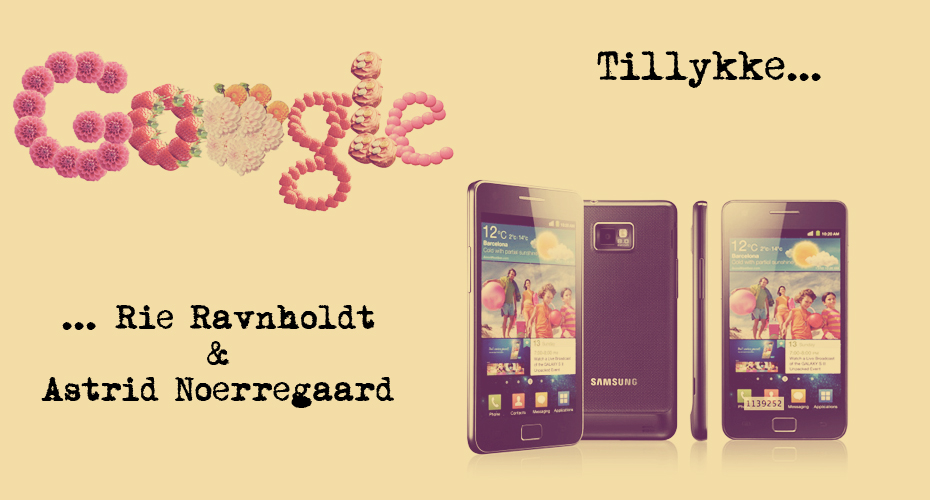 De heldige vindere i konkurrencen om en Samsung Galaxy S II blev Rie og Astrid. Stort tillykke! Hold udkig efter hvem som vinder Doodle 4 Google konkurrencen her. Vinderens doodle bliver ganske snart vist på Google.dk.