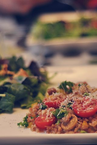 Kog pastaen til den er al dente. Imens varmes lidt olivenolie op i en stor pande ved siden af. Pastaen hældes i. Der må gerne komme lidt af kogevandet med. Smid alt andet i og rør det rundt i et minut. Parmesanen skal helst jævne kogevandet til en slags sovs. Salt og peber. That’s it.